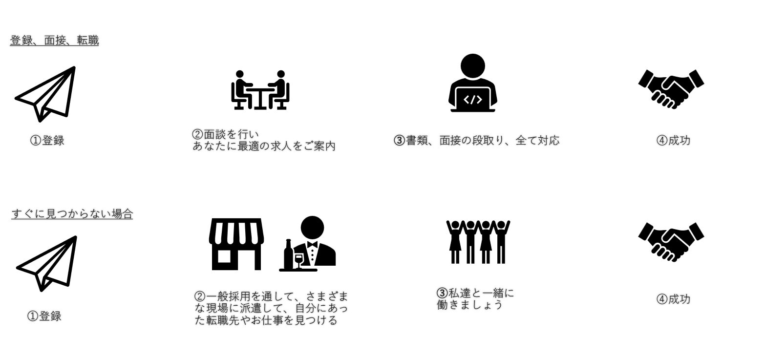 希望の転職先がすぐに見つからない場合は弊社の一般採用を通して各現場に配置をして、そこからあなたに